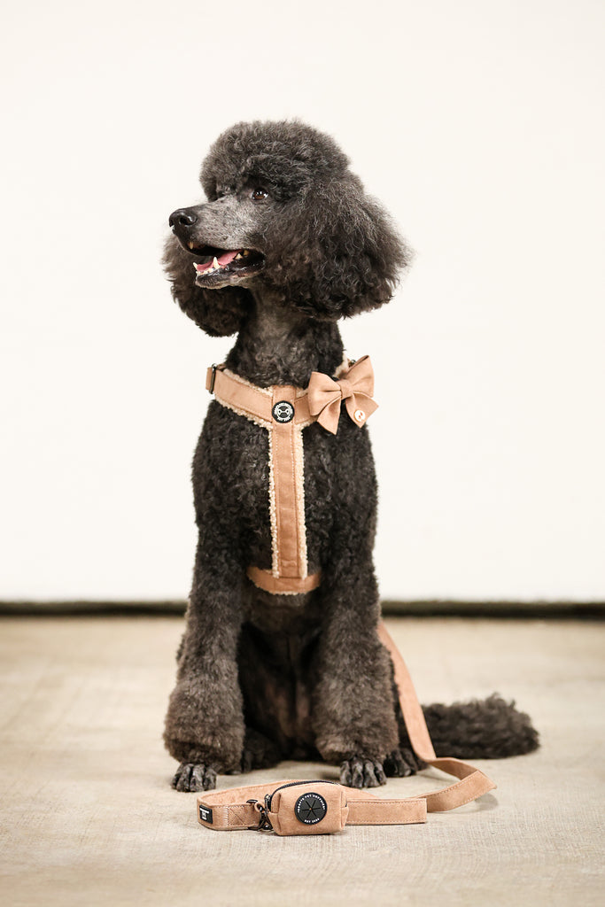 Pawradise Merlot Velvet Hondenset bestaande uit tuigje, riem en poepzakhouder in luxe fluwelen stof met gouden details – stijlvol en comfortabel.