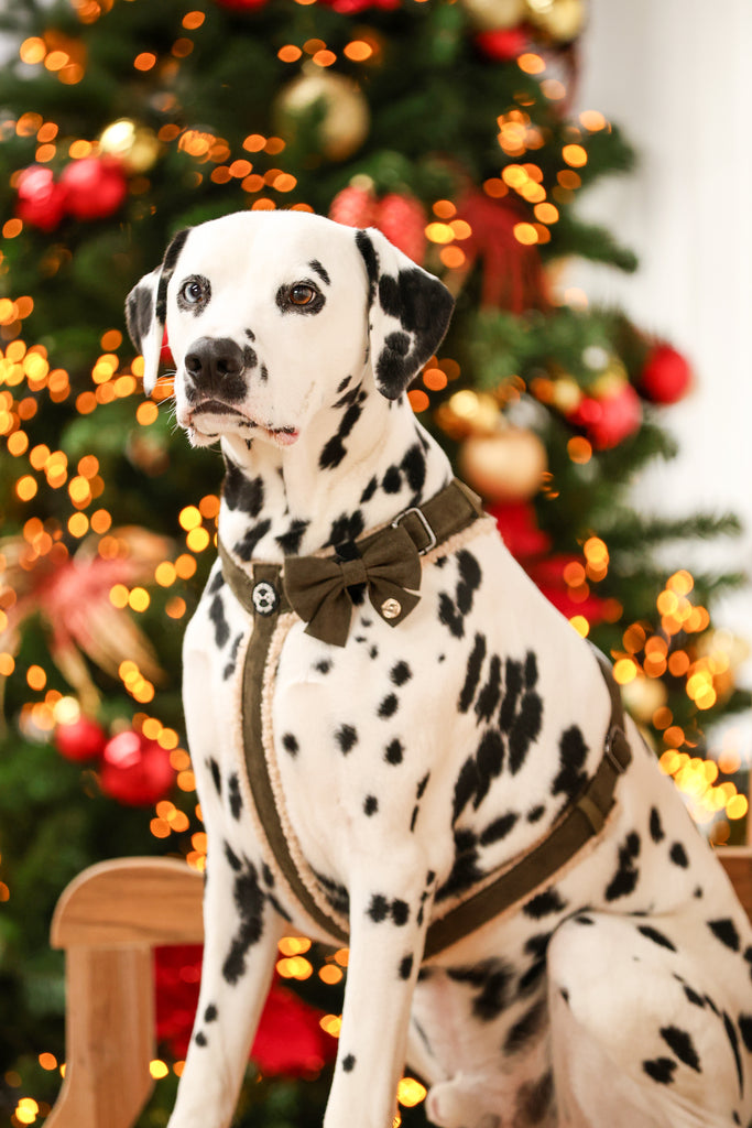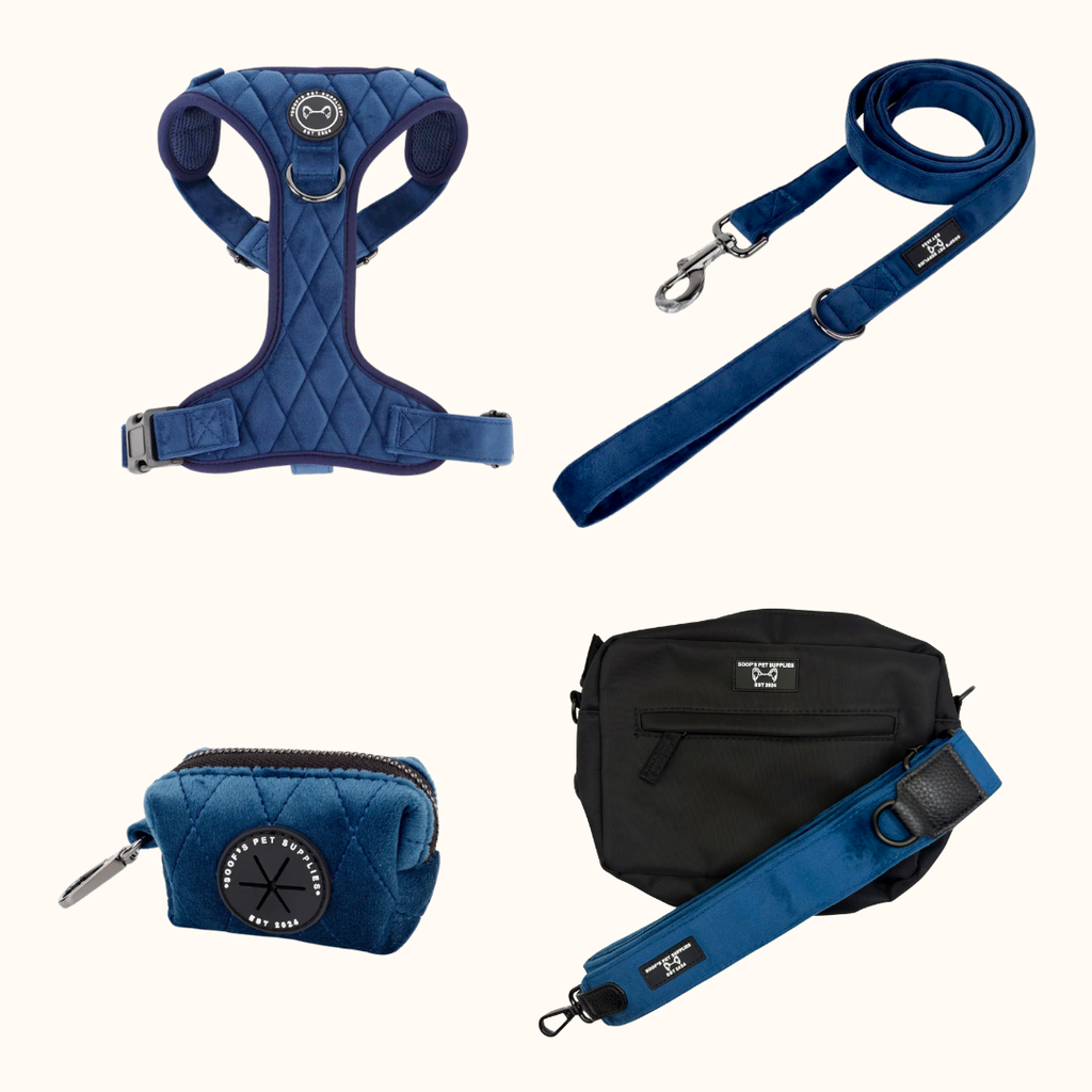 Pawradise Moss Velvet Hondenset bestaande uit tuigje, riem en poepzakhouder in luxe fluwelen stof met zilveren details – stijlvol en comfortabel.