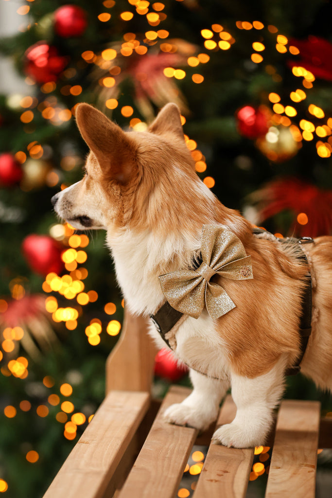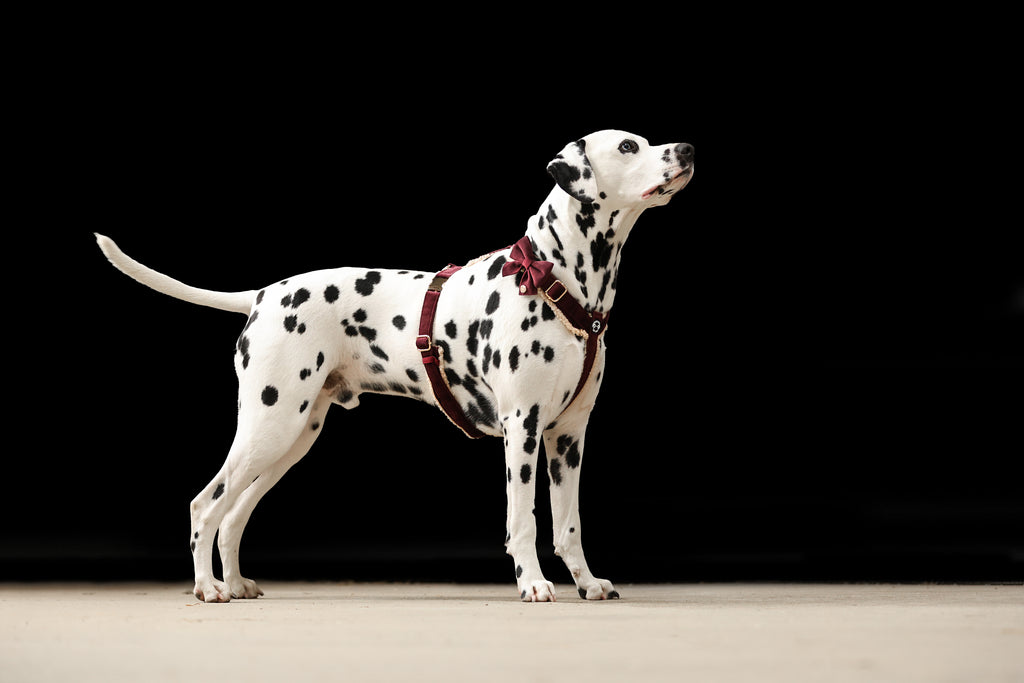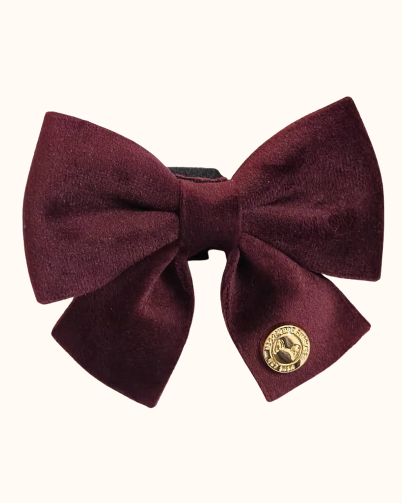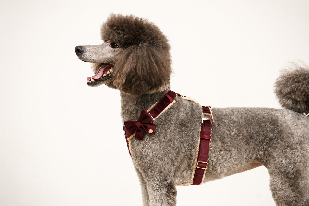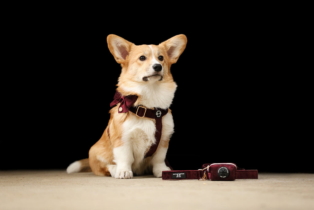Pawradise Merlot Velvet Hondenset bestaande uit tuigje, riem en poepzakhouder in luxe fluwelen stof met gouden details – stijlvol en comfortabel.